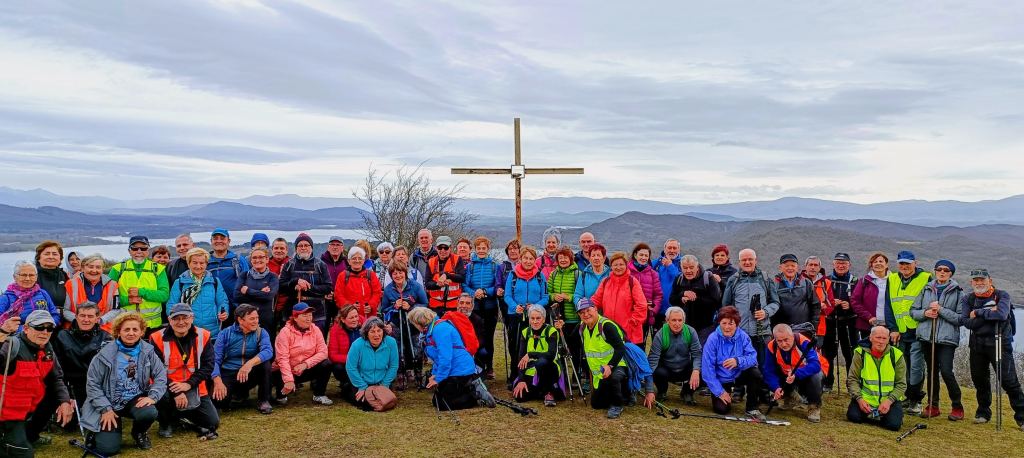 Iniciamos el trayecto por la carretera del embalse, para continuar, poco después, por un sendero de tierra y piedra, costeando el pantano. Nuestro habilidoso fotógrafo selecciona este bello entorno, para realizar la foto del grupo; como telón de fondo, el pantano, los montes que le rodean y la pasarela que cruzamos para acceder a la pequeña Cima de Santutxu. A cada paso, el matorral propio de monte bajo, se “apodera” de nuestros pies: arbustos, plantas leñosas, y ramajes de pequeños árboles. Por un camino herboso, al límite del embalse, cruzamos, de nuevo, la pasarela para seguir hacia Marieta. En este tramo del camino, percibimos el paisaje agrario, en la impecable “moqueta verde” de los campos de cultivo. En nuestro empeño de dotar de armonía la jornada, hacemos una pausa para compartir buen sol, buena brisa, buena cháchara y, hasta el hamaiketako; en este apacible rincón de Marieta. (Ref. Eustat.Marieta-Larrintzar cuenta con 81 habitantes. De ellos 45 son hombres y 36 mujeres, de los cuales, alrededor del 63% tienen una edad comprendida entre los 20 y los 64años.) Salimos del lugar, por una calle de viviendas rurales, por la que accedemos a la Gr38, “conocida como la “ruta del vino y del pescado”; en el entorno , destacan las pistas parceladas, con sus campos de cereal, y las torres de tendido eléctrico., por este camino iniciamos el ascenso hasta la Cima de Urbina, (Urbina Gain) continuamos por él hasta rodear una loma, que nos deriva, por la izquierda, a la cumbre, en el camino, un par de puestos de caza, y en la cima: una cruz y un ¿poste topográfico?. A modo de carrusel de feria, escoramos, ahora, desde el collado de Lotxate hacia la derecha, donde se asienta en la CimaTxikita, una cruz de hierro, no tan txikita. Desde este” mirador”, el paisaje de altura se “deja querer”: el Embalse, El Islote de Zuhatza Gorbea, Vitoria y sus montes y hasta el Polígono Industrial que nos convierte en poetas, sin serlo.(como dijera Unamuno, el paisaje que nos vio nacer).