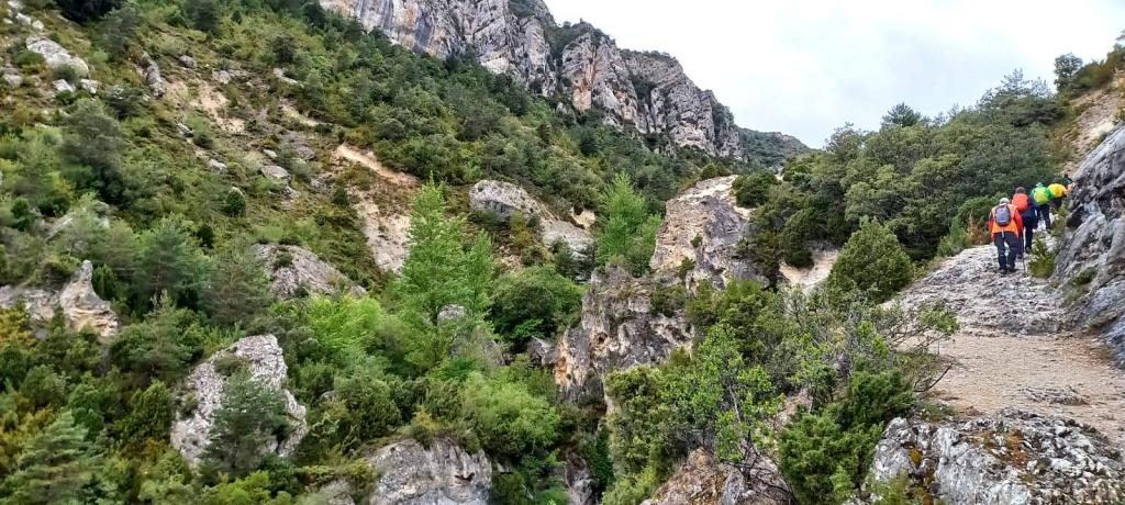 Remontamos el cauce del Río, por la derecha, siempre en ascenso. A medida que avanzamos, el sendero se estrecha. Entre las paredes de la sierra, llegamos a la primera garganta con una rampa metálica que corrige el paso. (Al parecer, por aquí pasaba una calzada romana que comunicaba los valles de Tobalina en Burgos y Valdegovía en Álava) (REF. Vox populi). Más adelante, al modo de “trampantojo”, en la roca, los restos de una ermita (San Andrés, dicen). Al rato, una asombrosa cascada, acompaña a “otra”, bien distinta, la del grupo de Paparazzis, que, en ausencia de nuestro fotógrafo oficial, brotan como esporas. (Algún que otro compañero vela por nuestra seguridad, invocando prudencia). Entre las paredes rocosas, continuamos el sendero que nos lleva a la segunda garganta. En este tramo del camino, sin abandonar el río, dejamos atrás el desfiladero y, continuamos nuestra ruta ascendente por la senda del Río entre pinos, encinas y numerosos arbustos, y su contrapunto, las torres eléctricas en la roca.