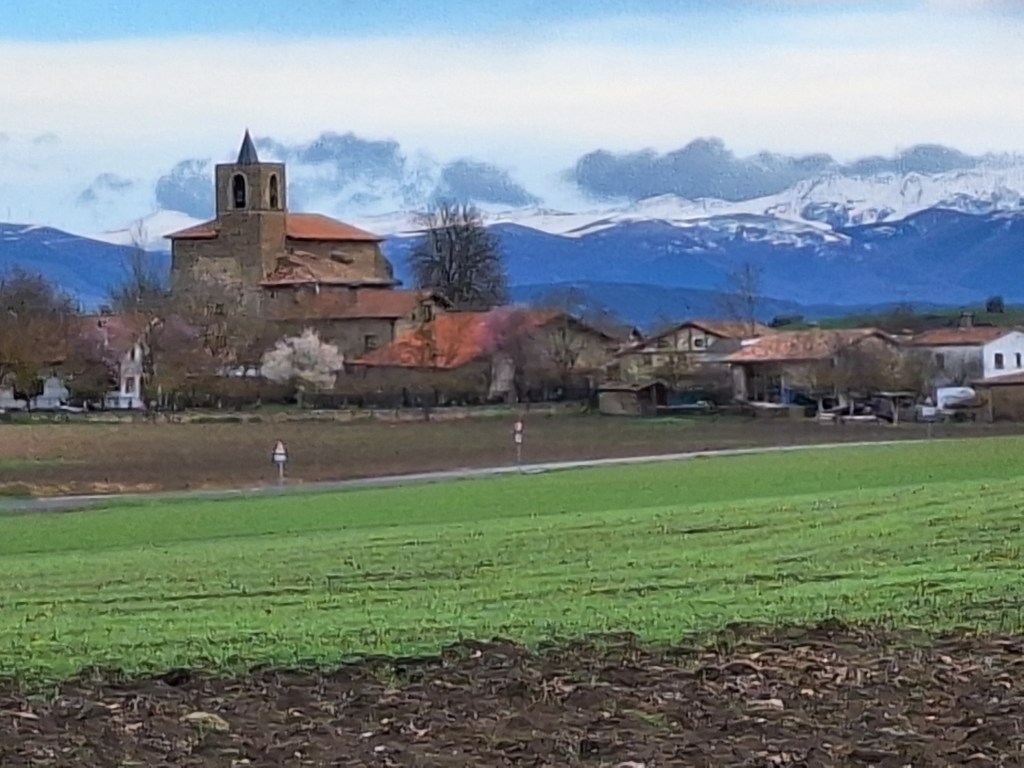 Un rato de callejeo por la Ciudad, y cerca de unas instalaciones deportivas, damos con el camino, a mano derecha, que discurre paralelo a la A-2130. Al rato, cruzamos el puente que salva la carretera y a medida que nos separamos de ella, la “Vía” se adentra en el entorno rural, recorriendo los caseríos de La Llanada, entre extensos sembrados y plantas de remolacha. De frente, una mirada al horizonte, con una bella postal del Parque Natural Aizkorri-Aratz, en blanco y gris; y a nuestra derecha, los Montes de Vitoria, dominando el Llano.